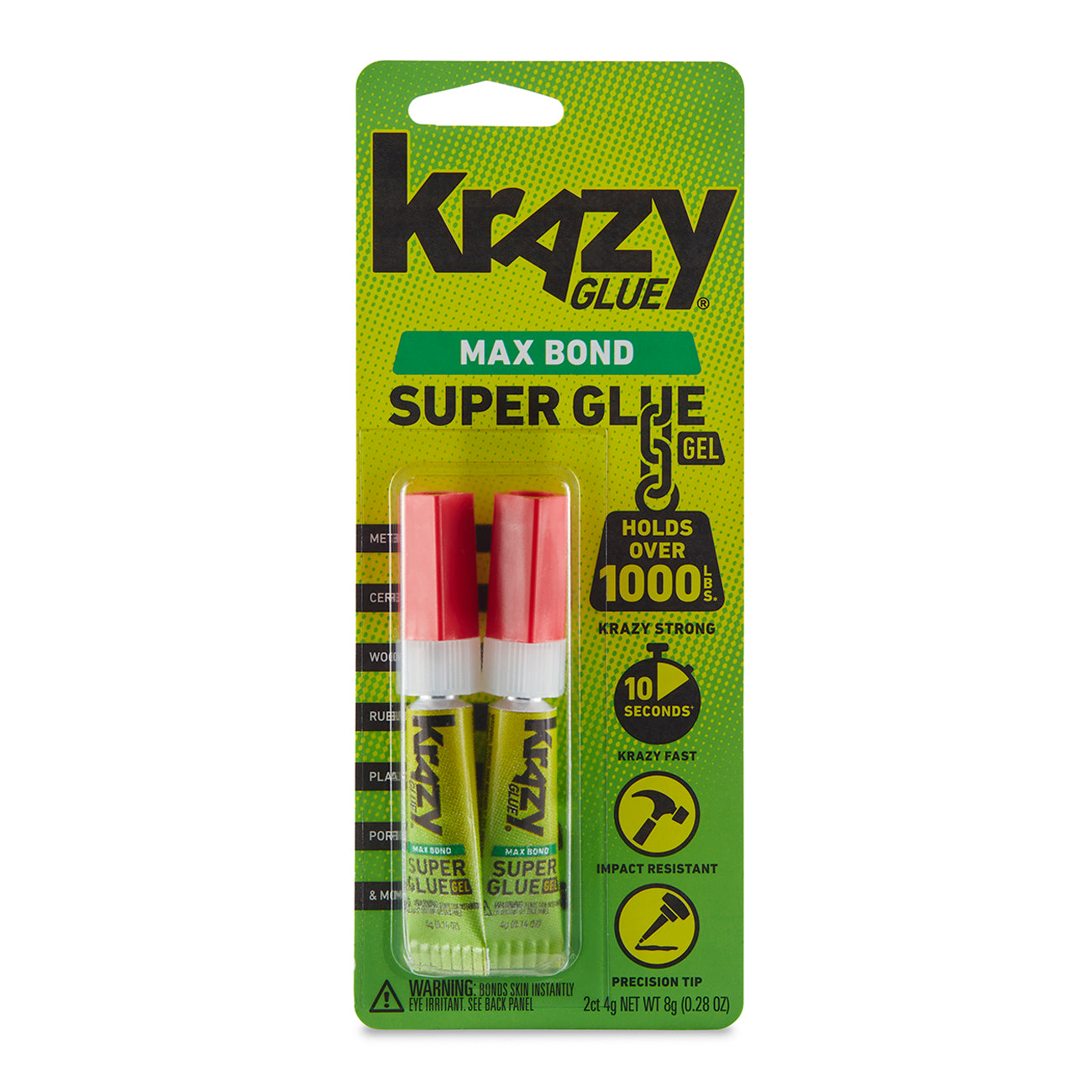 Maximum hold for every angle!For jobs that demand durability and control, there’s Glue Max Bond Super Glue Gel. Its no-run formula stays put on vertical and uneven surfaces, while its impact-resistant bond sets in just 10 seconds and holds more than 1,000 pounds. From household fixes to tough DIY projects, this gel formula makes strong repairs simple and precise.